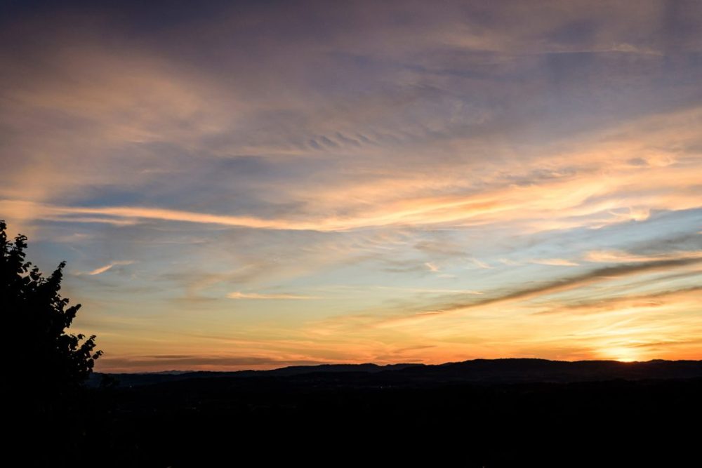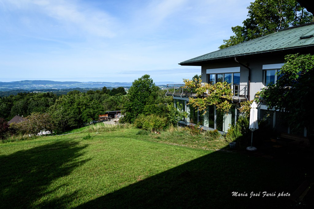 Vista desde el estudio una mañana de sábado de verano que parece otoño. En el centro, el gato de la granja situada abajo viene a tomar el sol en nuestros predios. Al fondo, Hinwil, el núcleo urbano que conecta por tren a la ciudades. Imprescindible para llegar a Zurich.