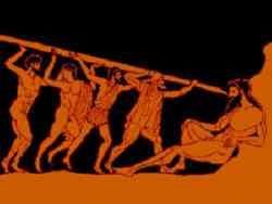 El Cíclope, halagado, se inclinó ante él y los marineros, agitando los brazos como un trirreme agita sus remos, exclamaron: